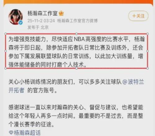 原來,開拓者官方和小楊工作室都對此進(jìn)行了發(fā)聲。開拓者官方告訴球迷們楊瀚森被下放是例行鍛煉,且球隊會在11月4日對陣湖人的比賽中將楊瀚森召回球隊,小楊會繼續(xù)參加NBA比賽。斯普利特教練組也沒有放棄對楊瀚森的培養(yǎng),相反這一次下放釋放了兩個積極信號。