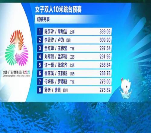 11月6日,2025粵港澳全運(yùn)會(huì)迎來(lái)了雙人女子10米臺(tái)預(yù)賽。世界冠軍組合陳芋汐/掌敏潔展現(xiàn)了出色的狀態(tài),5個(gè)動(dòng)作都得到了高分,所有的有效分都在8.0分以上,奉獻(xiàn)了高水平的比賽。她們最終以339.06分的高分排名預(yù)賽第一。全紅嬋和王偉瑩組合狀態(tài)不是很好,其中第四跳出現(xiàn)了失誤,只得到62.40分,全場(chǎng)得到297.54分,以預(yù)賽第三進(jìn)入決賽。