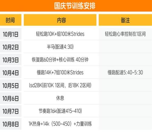 所以8天長(zhǎng)假里,狗哥的訓(xùn)練未曾有一絲懈怠——三場(chǎng)重點(diǎn)大課:一場(chǎng)長(zhǎng)間歇+短距離沖刺;430配速起跑、每5公里遞增10秒的15公里節(jié)奏跑;5分起底、每5公里遞增5秒的30公里L(fēng)SD。其余時(shí)間則以慢跑有氧作為恢復(fù)訓(xùn)練。