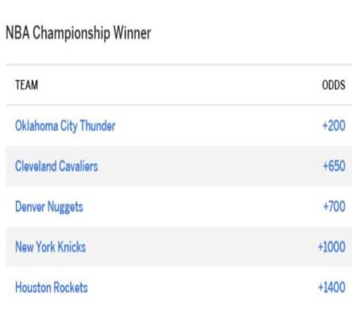 ESPN的冠軍賠率:雷霆 +200,斷層第一;