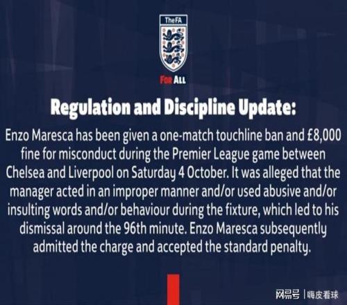 英足總已經(jīng)發(fā)出公告,切爾西面對利物浦的比賽中,第96分鐘,馬雷斯卡由于存在不當行為,存在使用侮辱性的言語,主裁判因此出示紅牌,被罰離場。有鑒于此,馬雷斯特需要禁賽一場,同時還要繳納8000英鎊的罰款。馬雷斯卡已接受了關于事實的指控,愿意接受相應的處罰。