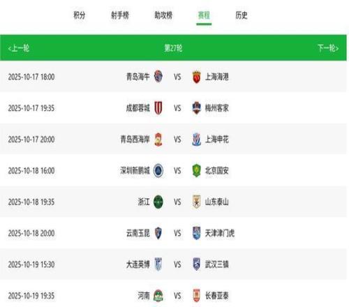 中超第27輪賽程,18日、19日的比賽,央視五套轉播蘇超,中超放在其余頻道直播。
