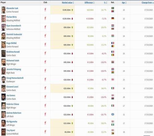 北京時(shí)間10月17日,德轉(zhuǎn)市場(chǎng)更新了最新一期的英超球員身價(jià)。利物浦隊(duì)中伊薩克身價(jià)上升2000萬歐元,赫拉芬貝赫上升1500萬,維爾茨下跌1000萬歐元。