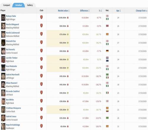 北京時間10月17日,德轉(zhuǎn)更新了英超球員身價,阿森納身價變動球員如下。
