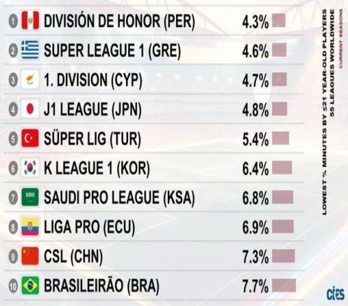 近日,瑞士著名足球權(quán)威統(tǒng)計機構(gòu)CIES(國際體育研究中心)發(fā)布了一份針對全球55個頂級聯(lián)賽的最新統(tǒng)計報告,衡量各國聯(lián)賽對年輕球員的培養(yǎng)力度,U21球員出場時間占比。這份榜單的排名方式是由低到高,即排位越靠前,代表該聯(lián)賽的U21球員出場時間占比越少,也意味著這個聯(lián)賽越不給年輕人機會。榜單數(shù)據(jù)顯示,中超聯(lián)賽在這份榜單的排名中高居前列,揭示了中國足球在青訓(xùn)轉(zhuǎn)化上的深層危機。