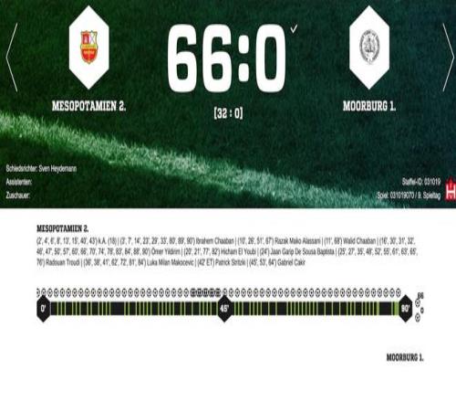 上周日的比賽成為德國地區(qū)聯(lián)賽史上最慘烈的失利之一。穆爾堡TSV在漢堡地區(qū)聯(lián)賽對陣梅索波塔米亞二隊時,全場遭遇重創(chuàng),90分鐘內(nèi)被攻入66球,平均每82秒丟一球。主教練帕特里克-施特里茨基坦言,這是一場徹底的噩夢。